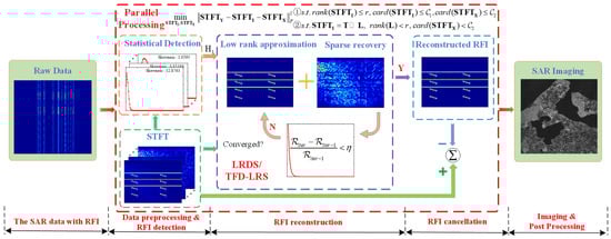 Flowchart of the proposed algorithms incorporating the SAR imaging process. ① and ② present the RFI reconstruction models of LRDS and TFC-LRS, respectively. A complete RFI mitigation procedure in SAR system should contain the data preprocessing, RFI detection, RFI reconstruction, RFI cancellation, and SAR imaging.