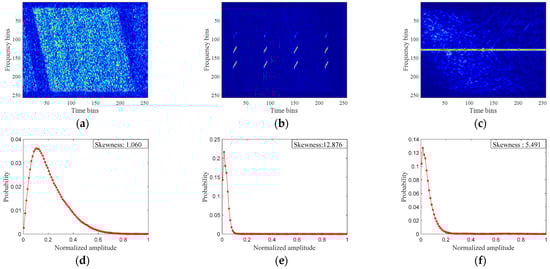 Statistical analysis of SAR echo spectrograms: (a) RFI-free signal; (b) WBI-corrupted signal; (c) NBI-corrupted signal; and (d–f) histograms and skewness, respectively, corresponding to (a–c). It is easy to see that the NBI concentrates in several frequency points while WBI occupies a larger frequency band. Furthermore, they all gather in limited regions with the higher amplitude in the spectrogram, which increases the value of TF skewness.