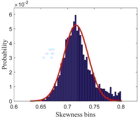 To analyze the mathematical representation of , the no-RFI SAR dataset was established first to fit the statistical distribution. This dataset was recorded by the Sentinel-1 satellite on 3 June 2021, and was not disturbed by RFI. Figure 4 shows the histograms and statistical fitting curve of skewness calculated from the no-RFI SAR dataset, which declares that the skewness tends to a Gaussian distribution asymptotically. Therefore, the optimal threshold of skewness based on the Neyman–Pearson criterion is