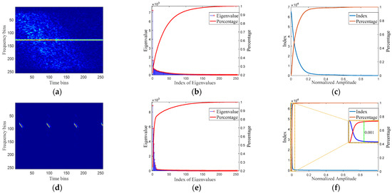 Structural analysis of RFI in the TF domain: (a,d), spectrograms of SAR echoes contaminated with NBI and WBI, respectively; (b,e), Eigenvalue sequences corresponding to (a,d), respectively; (c,f), amplitude analyses for (a,d), respectively.