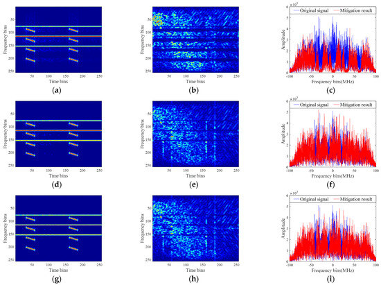 The above experiments verified the effectiveness and superiority of the proposed RFI mitigation algorithms. Next, the NBI mitigation experiments were conducted on the measured NBI-contaminated SAR data to evaluate the robustness of the proposed algorithms. Figure 16a represents the measured SAR data, which were contaminated by strong NBI in the two-dimensional time domain. The RFI detection results at a false alarm rate of are presented in Figure 16b based on the TF skewness detection method.