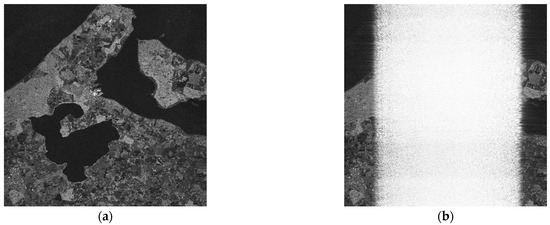 Furthermore, the measured WBI-contaminated SAR data were utilized to validate the superiority and robustness of the proposed RFI mitigation algorithms. Figure 19a represents the SAR data in the two-dimensional time domain, and the WBI detection results are shown in Figure 19b at a false alarm rate of ; these results facilitated the following RFI mitigation procedure.