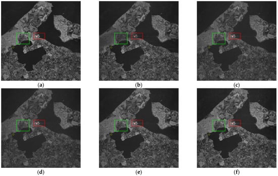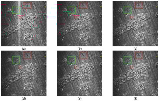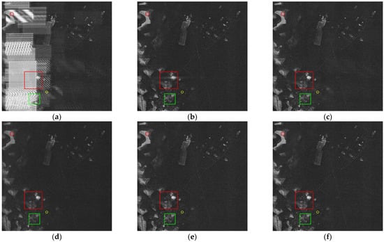 Resulting SAR image after applying (a) the SAR imaging algorithm applied directly for the original data, (b) ISNF, (c) ESP, (d) GoDec, (e) LRDS, and (f) TFC-LRS.