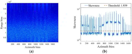 where denotes the expectation operator, and represent the mean and variance of , and the term with subscript is a matrix element in the th row and th column. The skewness value ranges among . It is straightforward to show that the skewness of a pure Gaussian distribution is zero, but it deviates from zero when non-Gaussian signal sources are presented, as shown in Figure 3. A distribution with positive skewness would have a more acute peak on the left and a fatter tail on the right than the Gaussian distribution, whereas a distribution with negative skewness would have a peak on the right and a tail on the left. The stronger amplitude of RFI components indicates a positive skewness for the distribution of RFI-corrupted SAR echo. The skewness value of the RFI-free snapshot shown in Figure 3d is 1.06, whereas the RFI-corrupted pulses shown in Figure 3e,f are equal to 12.867 and 5.491, respectively. This supports the conclusion that there is an apparent statistical difference between the RFI and TES.