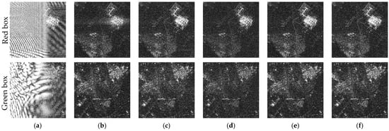 Comparison of the enlarged areas in Figure 17. (Row 1): the red box region; (Row 2) the green box region. (a) The RFI-free SAR image, (b) ISNF, (c) ESP, (d) GoDec, (e) LRDS, and (f) TFC-LRS.