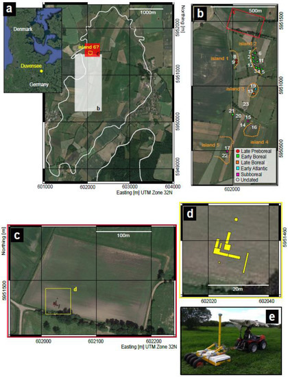 Area of investigation including archaeological and geophysical research. (a) Location of the Duvensee area focused on the extent of the lake during the early Holocene (white line) [6]. (b) Dating and location of the excavated sites together with the positions of the former islands based on the geophysical results reported in [10] (orange dashed lines). The numbers refer to the names of each dwelling site. (c) Area of interest with the archaeological excavations carried out between 2018 and 2020. (d) Focus on the archaeological trenches. (e) GPR measurements with the 16-channel 400 MHz MALÅ Imaging Radar Array (MIRA).