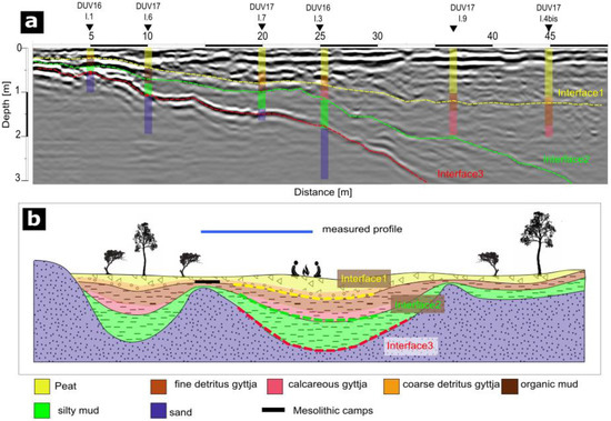 Comparison between GPR results and stratigraphy. (a) A GPR profile together with stratigraphy. The transitions between the sediment layers are indicated with dashed lines and the sediment with different colors. The yellow line (Interface1) indicates the transition between coarse organic sediments (i.e., peat and coarse detritus gyttja) and more fine organic sediments (i.e., fine detritus gyttja and calcareous gyttja). The green line (Interface2) indicates the transition between fine organic sediments (i.e., fine detritus gyttja and calcareous gyttja) and the clayish-loamy sediments. The third reflection (Interface3) represents the transition between the clayish-loamy layer and the basal sands. (b) Interpreted model for the development of the Duvensee bog during the Mesolithic period (according to [50] and [17]).