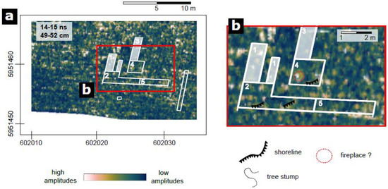 In this subsection, a focus on the GPR depth-slices and the main archaeological features of the excavations are presented. To make the interpretation more clear, the color scale was changed with respect to the depth-slices reported in Figure 4. Figure 5a shows the depth slice at approximately 50 cm in depth, which correlates with the archaeological level reported in Figure 2; the high amplitude values are indicated with bright colors and the lower values with dark blue. No organized anomalies were visible; however, a focus on the trenches (Figure 5b) allowed a detailed analysis—some high amplitude areas were in line with the sand accumulations that marked the shoreline in trenches 2 and 4. It was not a defined horizon, but rather different scattered sand clusters that could be correlated to wave activity on the shoreline. Another low amplitude area was evident in trench 2 between the scattered high amplitude anomalies. The comparison with the excavations suggested that this was the location of a tree stump. In trench 4, a small fireplace was detected, and we noticed a higher amplitude area at the same position. Note that trenches 1 and 3 were excavated prior to the geophysical survey; thus, anomalies in these areas do not represent the original in situ conditions and are therefore filled in white.