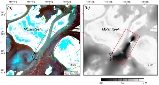 (a) Molar Reef as seen by the WorldView-2 satellite at 23:37 UTC 22 August 2020. Shown are data from bands 5, 3, and 2 (red, green, and blue wave lengths) but the color ranges have been stretched to reveal both water surface scattering and water color changes across the channel. Red rectangle shows the analysis area, which is aligned with the main channel between Molar Reef and the unnamed reef lying to the southeast. (b) Bathymetry has 100-m spatial resolution [17]. Scale bar indicates depth in meters.