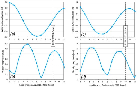 Predictions of water surface elevation and surface current speed coinciding with WorldView-2 data collected at 23:37 UTC 22 August 2020 (a,b) and 23:59 UTC 4 September 2020 (c,d), as indicated by the two dashed, vertical lines. Data shown were extracted from the “ereefs” model archive at the center of the study area shown in Figure 2.