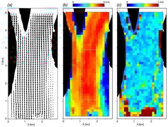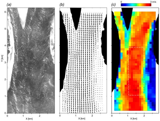 Velocity field at mid-flood as derived from PIV analysis of an image pair (looks 6 and 7) having a time separation of Δt = t2 − t1 = 11.6 s (see Table 1). (a) Red-edge imagery at time t1; (b) velocity vectors; (c) velocity magnitude. Black areas are a land mask. The longest vector in (b) has a length of 4.37 m/s. Dashed rectangle in (c) shows area used for spatial averaging.