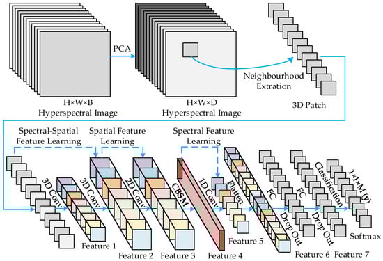 Hyperspectral images (HSIs) are three-dimensional (3D) volumetric data with a spectrum of continuous and narrow bands, which can reflect the characteristics of ground objects in detail [1]. In recent years, many mini-sized and low-cost HSI sensors have appeared, which makes it easy to obtain HSI data with rich spatial–spectral information, such as AisaKESTREL10, AisaKESTREL16, and FireflEYE [2,3]. In this context, HSI is widely used in the fields of resource detection, environmental analysis, disaster monitoring, etc. [4,5,6]. The classification of HSI is a basic analysis task that has become very popular [7]. However, due to the influence of the small number of samples (small samples), the high-dimensional characteristics, the similarity between the spectra, and the mixed pixels, efficient and accurate classification of HSI data has been a challenging task for many years [8,9,10]. To solve these problems, some deep learning network models have been applied in HSI processing [11], especially the convolutional neural network (CNN).