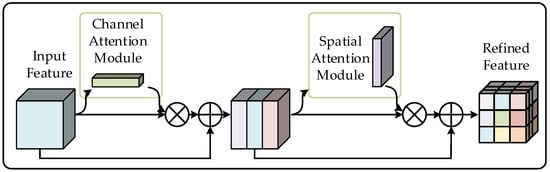 where represents the multiplication by the element, and denotes the elementwise addition. In the computational process of the multiplication, the refined map and are broadcasted accordingly to form a 3D attention map—the channel attention map is broadcasted following the spatial dimension, and the spatial attention map is broadcasted following the spectral dimension. Then, all the 3D attention maps are multiplied with the input map or in an elementwise manner. In the computational process of the addition, the process between two maps denotes that two elements in the same 3D spatial position are added together, and the process between the and a map represents each element of the map plus 1. indicate the intermediate feature map refined by . is the final refined feature map through the CBSM model, which is illustrated in Figure 2.