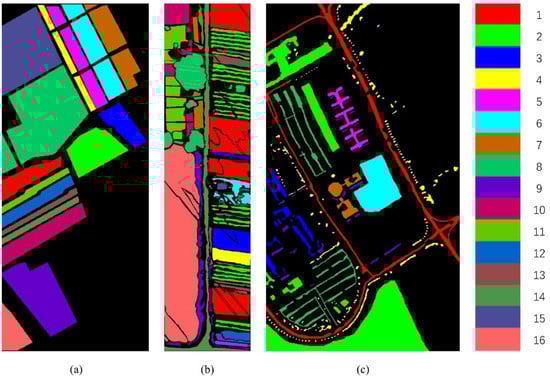 The SA dataset was collected by an AVIRIS sensor in 1992 in the Salinas Valley area of the United States. This dataset has a spatial resolution of 3.7 m, a spectral resolution of , and a spectral range of . In this dataset, the image size is 512 × 217 pixels, and the number of labeled classes is 16. It composes 224 bands, including 20 bands with atmospheric moisture absorption and a low signal-to-noise ratio should be deleted. In this study, 204 bands were retained for the experiments. Figure 3a shows the ground truth of the land cover of the SA dataset. Table 1 shows the real mark classes of the dataset, the s of samples in the training, and the testing set.