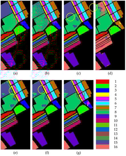 Ground truth and classification results of the SA dataset: (a) ground truth; (b) SVM; (c) 2D CNN; (d) 3D CNN; (e) 3D–2D–1D CNN; (f) 3D–2D–CBAM–1D CNN; (g) MDAN (3D–2D–CBSM–1D CNN). This figure shows the classes with lower classification accuracy in the yellow circle and the red circle.