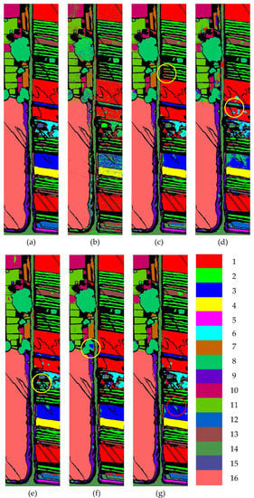 Ground truth and classification results of the WHU dataset: (a) ground truth; (b) SVM; (c) 2D CNN; (d) 3D CNN; (e) 3D–2D–1D CNN; (f) 3D–2D–CBAM–1D CNN; (g) MDAN (3D–2D–CBSM–1D CNN). This figure shows the classes with lower classification accuracy in the yellow circle and the red circle.