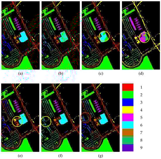 Ground truth and classification results of the PU dataset: (a) ground truth; (b) SVM; (c) 2D CNN; (d) 3D CNN; (e) 3D–2D–1D CNN; (f) 3D–2D–CBAM–1D CNN; (g) MDAN (3D–2D–CBSM–1D CNN). This figure shows the classes with lower classification accuracy in the yellow circle and the red circle.