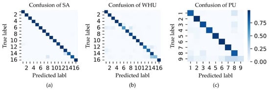 The confusion matrices of MDAN in the three selected datasets: (a) the confusion of the SA dataset; (b) the confusion of the WHU dataset; (c) the confusion of the PU dataset.