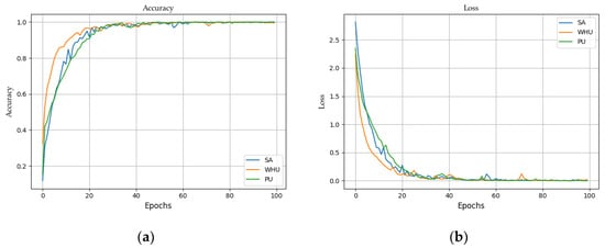 Accuracies and loss convergence versus epochs of the proposed MDAN model using on the WHU, SA, and PU datasets: (a) accuracies; (b) loss.