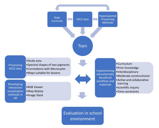 All three aspects of RS methodology, AR development, and an educationally sound workflow were executed simultaneously, as shown in Figure 1. Hence, the topic was chosen as a combination of (1) available data from the chosen sensor, (2) processing methods understandable for high school students, (3) high relevance for at least a few states curricula. Any unexpected changes to one of the three aspects were reassessed for the other two at all times. Ultimately, the published app and workflow were evaluated with students in a real school lesson environment.
