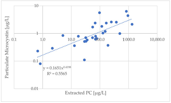 As for the 2013/2014 data in [27], a double logarithmic relation between phycocyanin and microcystin can be deduced from the 2011 biological data (see Figure 6).