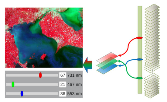One image was taken per ISS orbit, which takes 90 min each. Each scene consists of 128 bands between 353 nm and 1080 nm wavelength, however, only 87 between 400 and 900 nm are usable (see Figure 2), as the ones above and below those wavelengths contain a lot of visual noise, i.e., stripes and blur. Each image is 2000 by 512 pixels in size. The images’ spatial resolution varied around 90 m due to the orbit constellation of the ISS [22]. Over 10,000 scenes were taken. However, many analyzed rock formations, and only very few were suitable for any topic that could be covered in lessons. The authors searched specifically for algal blooms in Europe, since the materials are to be used primarily by German schools, but no image covered a sufficiently visible bloom. In the end, the algal bloom in Lake Erie was determined to be the best topic to create a lesson from under the given requirements. HICO data can be downloaded for free at the NASA Ocean Color portal and processed with the free ESA Sentinel Applications Toolbox.