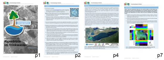 Worksheet “Algal bloom in the water supply”. (P1): cover sheet, doubles as marker image for maps in Figure 14. (P2): Tasks 0 (preparatory) to 3. (P4): Introduction text to be read in task 1 and respective marker for the HDEV video (P7): Optional task 5 using the image stack from Figure 12. (Source: authors).