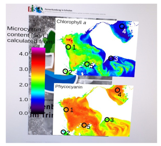 The fourth task brings all of the information together and introduces students to the method of distinguishing between harmless and potentially harmful algae with hyperspectral imagery. The students are to read an information text about the differences between green and blue algae and how their pigments, chlorophyll a and phycocyanin, can be differentiated using images of high spectral and high spatial resolution. They are also introduced to the toxin produced by the algae in this specific algae bloom, microcystin. Together with the information from the videos earlier, the students are to discuss how images of different spatial and spectral resolution yield different results. Through the app, they can see two maps of algae concentration derived from the HICO data in Lake Erie in 2011 (Figure 14) and the Landsat image. The virtual content replaces the on-screen zoom function, so the students can see details in the maps by moving their smartphone closer to the marker image. This allows them to see each pixel in the small maps as well as the very large Landsat image that spans more than one A4 sheet to provide a high resolution.