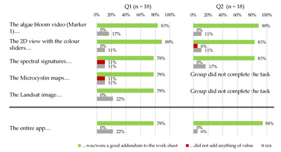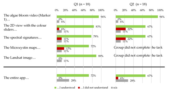 - Only the Q1 group had the time to do the fourth task and, thus, the questions about this part were only evaluated from that group (Figure 20). Students came to the correct conclusion about the content of toxic algae but thought the hyperspectral data could determine the exact amount of the toxin, when the worksheet should have taught them that there are several ways to approximate the content from hyperspectral data.