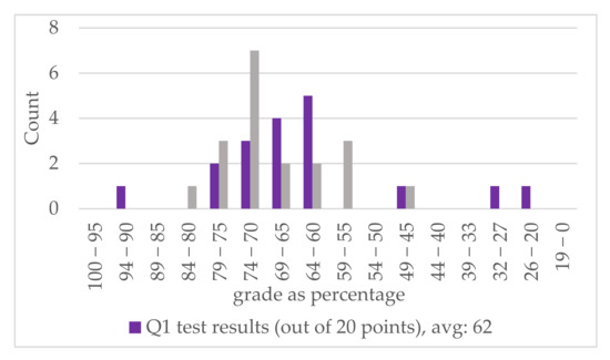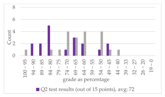 In comparison with their written grades in the rest of the semester, Q1 performed slightly worse in the evaluation and Q2 slightly better (Figure 21 and Figure 22). The written grades are an average of all written exams per student in the semester. There were more students in the “very good” range (100 to 85%) in both tests than through the average written grades, but the only two failing grades (<40%) were also from the tests. Due to the high anonymization standards of the school, no direct comparison between individuals could be drawn.