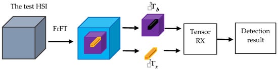 As shown in Figure 1, the proposed FrFT-TRX is based on FrFT and TRX. First, the fractional order of FrFT, p, is selected by FrFE maximization. Then, the test HSI is transformed into the FrFD by FrFT. Next, TRX is employed for hyperspectral AD in the FrFD. Finally, according to the optimal spatial dimensions of target and background tensors, the optimal AD result is achieved by adjusting the value of p. The detailed procedure of the proposed FrFT-TRX algorithm is shown in Algorithm 1.