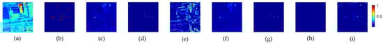 Data P and two-dimensional diagrams of detection results: (a) 100th band of data P; (b) Ground-truth map; (c) GRX; (d) LRX; (e) KRX; (f) FrFE-RX; (g) FrFE-LRX; (h) PCA-TRX; and (i) FrFT-TRX.