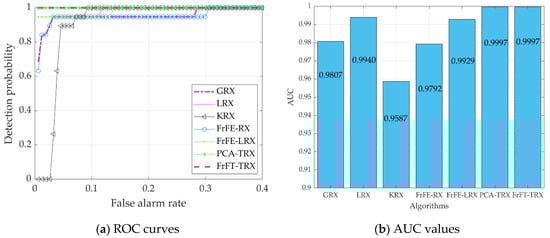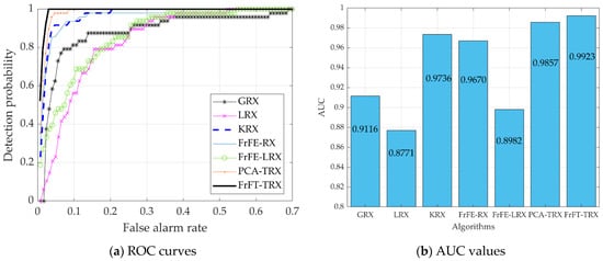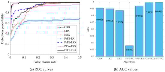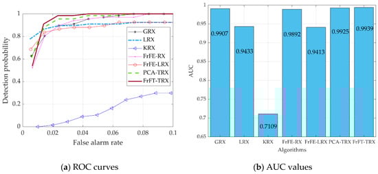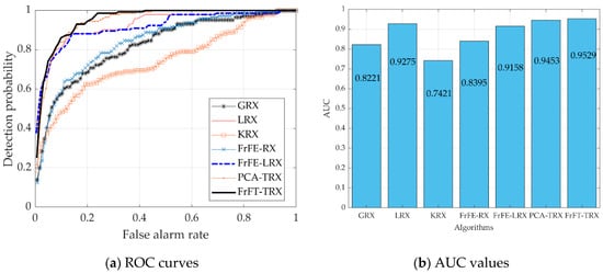 Six existing algorithms were used for comparison, in order to verify the effectiveness of the proposed FrFT-TRX algorithm: GRX and LRX, the benchmark AD algorithms; KRX, a classical transform domain method; FrFE-RX, a new RX algorithm in the FrFD; FrFE-LRX, the local algorithm version of FrFE-RX; and TRX, which is based on dimensionality reduction by principal component analysis (PCA-TRX). Two-dimensional diagrams of the detection results were used for subjective evaluation. The receiver operating characteristic (ROC) curve, area under the ROC curve (AUC), and separability graph were used for objective evaluation.