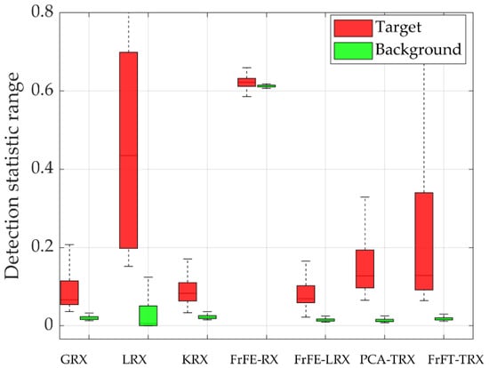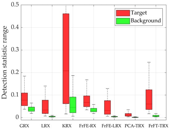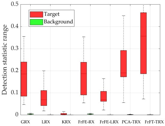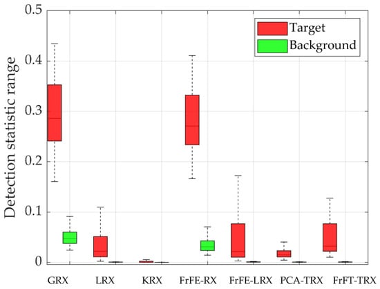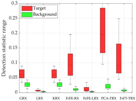 For data L, as shown in Figure 2, the AD results of the proposed FrFT-TRX algorithm were obviously better than those obtained by the comparison algorithms. The ROC curves and the corresponding AUC values are shown in Figure 3. Among the seven tested algorithms, the proposed FrFT-TRX algorithm had the best ROC curve and the largest AUC value. Figure 4 shows the separability graphs for data L, where the boxes in the separability graph indicate pixels without the highest and lowest 10% of the data in each category, and the maximum and minimum values are shown in the top and bottom rows, respectively. For data L, as shown in Figure 4, FrFT-TRX could better separate the target from the background than the six comparison algorithms, and its ability to compress the background was better than that of GRX, KRX, and FrFE-RX.
