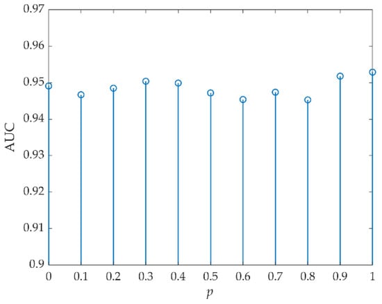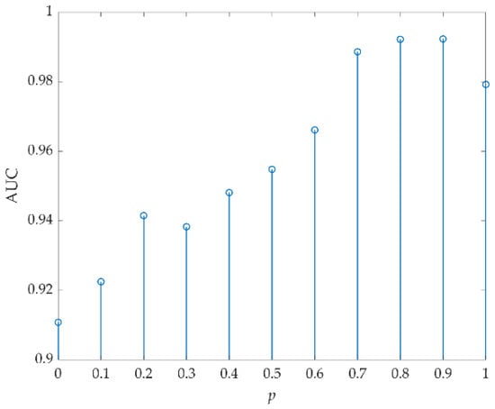 For data S, p was first selected by FrFE maximization, where p = 0.9. The AUC values versus (Wt, Wb) are listed in Table 8, and the optimal value was 0.9923 when (Wt, Wb) were set to (3, 31). Then, (Wt, Wb) were set to (3, 31) and Figure 21 shows the AUC values versus p. The optimal AUC value was 0.9923 and the corresponding optimal p was 0.9.
