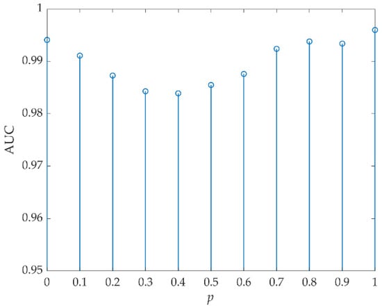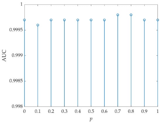 For data C, p was first selected by FrFE maximization, where p = 1. The AUC values versus (Wt, Wb) are listed in Table 5, and the optimal value was 0.9997 when (Wt, Wb) were set to (3, 23). Then, (Wt, Wb) were set to (3, 23) and Figure 18 shows the AUC values versus p. The optimal AUC value was 0.9998 and the corresponding optimal p was 0.7 or 0.8.