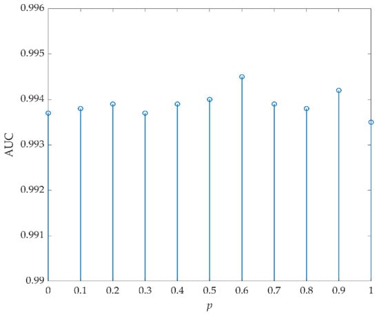 For data T, p was first selected by FrFE maximization, where p = 1. The AUC values versus (Wt, Wb) are listed in Table 7, and the optimal value was 0.9935 when (Wt, Wb) were set to (7, 9). Then, (Wt, Wb) were set to (7, 9) and Figure 20 shows the AUC values versus p. The optimal AUC value was 0.9945 and the corresponding optimal p was 0.6.