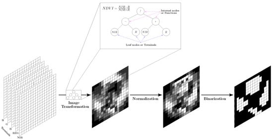 Complete diagram of the operation of the algorithm to detect mistletoe in multispectral images. In the Image Transformation stage, we illustrate, as an example, the internal nodes or functions and the leaf nodes or terminals required by the Genetic Programming (GP) algorithm to implement the NDVI index.