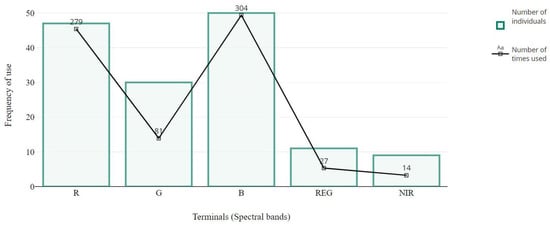Frequency distribution of the use of terminals in the best individuals evolved by GP. The bar diagram shows how many of the best individuals have used the corresponding terminals; i.e., the and bands; the line graph shows the number of times that the terminals have been used in total within the best solutions individuals.