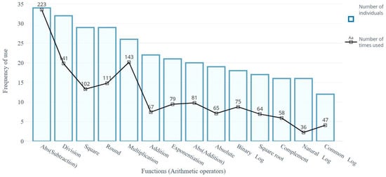 Frequency distribution of the use of functions in the best individuals evolved by GP. The bar diagram shows how many of the best individuals have used the corresponding functions (arithmetic operators), while the line graph shows the number of times that the functions have been used in total within the best-solution individuals.