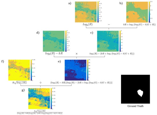 Example of the partial results obtained by applying the second factor of the best solution, shown in Equation (4), on an image. The letters (a–g) show the performance (visual result) of each term in the equation that is expressed below the corresponding image.