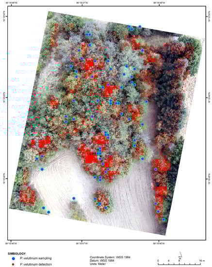 In Figure 9, the result of the implementation of the GP algorithm for the automated detection of Phoradendron velutinum in the case study of the Conservation Area of Mexico City is shown in red spots; for comparison purposes, the in situ sampling of P. velutinum was overlapped and displayed in blue circles in the same figure. A section of the study area mentioned previously was taken as an experiment, to visualize the areas affected by mistletoe. It is worth mentioning that the implementation refers to the final use of the best algorithm generated with GP (see Equation (4)) directly in the images to be classified, obtaining the location of infestation hot spots by P. velutinum related to the flowering stage.