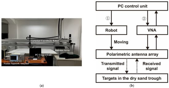 To verify the feasibility of the LFD method, FP-GPR measurements were performed in the laboratory on three typical targets. The ultrawide-bandwidth (UWB) stepped-frequency FP-GPR system used in the measurements is shown in Figure 2, which uses a vector network analyzer (VNA) to transmit the electromagnetic waves with the frequency band of 0.8–4 GHz. During a measurement, the system operates as follows: step ①: the PC controls the robot to move the antenna array to a certain position; step ②: the PC controls the VNA to transmit EM waves through the antenna array and to receive the returned signals from the target.