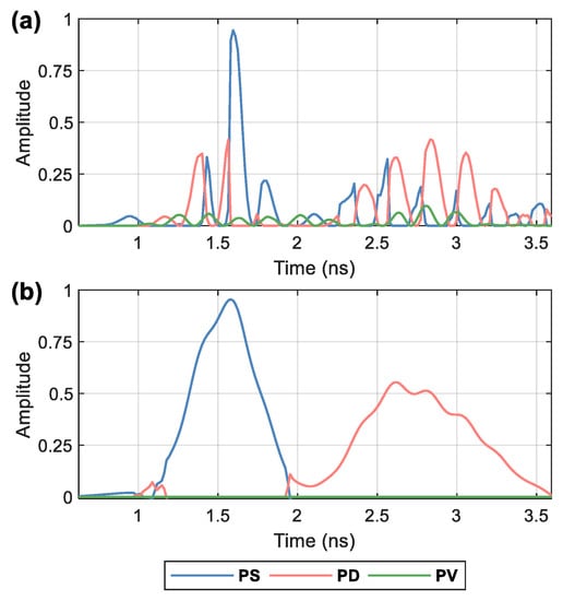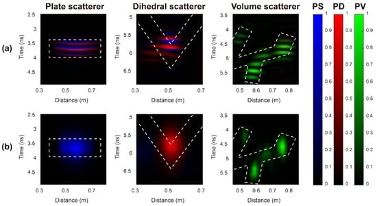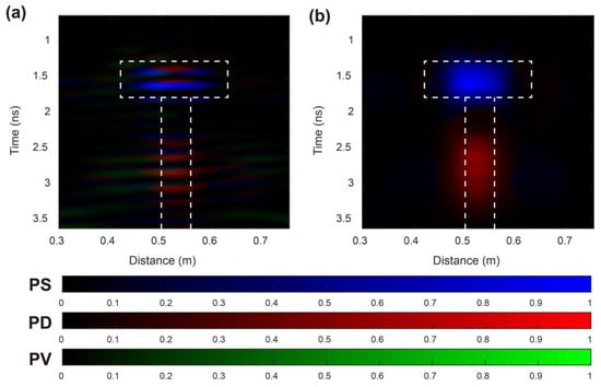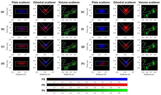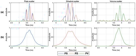 Subsequently, the classic FD method and the proposed LFD method were performed for the misaligned data after the Kirchhoff migrations. The single-trace signals in Figure 6 were extracted from the derived PS, PD, and PV results, which are located in the middle of the rectangular regions in Figure 4. The results of the FD and LFD methods are shown in Figure 6a,b, respectively. The PS and PD components alternate in the processing results of the signals from the plate and dihedral targets, which are erroneous and will therefore severely interfere with the identifications of these two objects. The misalignment has little impact on the FD result of the signals from the volume scatterer. However, the LFD method shows more continuous, smoother, and accurate results for the signals from all three types of targets.