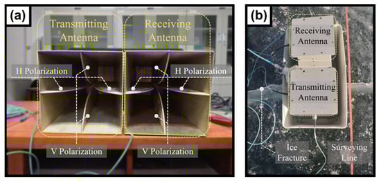 The FP-GPR system and the ice fracture detection test. (a) The polarimetric antenna array used in the field measurement; (b) The field FP-GPR measurement on the ice fracture.