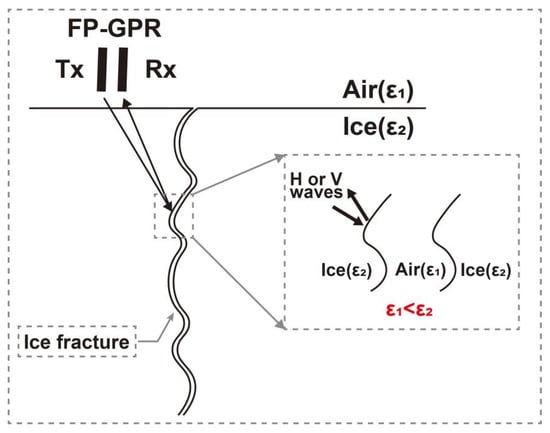 The ice fracture is shown in Figure 8b which penetrates the entire ice sheet. Figure 9 presents the FP-GPR data before and after Kirchhoff migrations. The signals from the ice fracture are composed of many hyperbolas. As the boundaries of the ice fracture are irregular and rough, these hyperbolas are considered to be generated by the scattering points on the ice-fracture boundaries, which can be illustrated by Figure 10. According to this schematic diagram, we can find that the signals from the ice fracture mainly contain the surface-like scattering component. However, we would like to highlight that the ideal surface-like and the double-bounce scatterers in synthetic aperture radar (SAR) theory, defined under the important condition that the EM waves are transmitted from a medium with a low dielectric constant to a medium with a high dielectric constant (air and land) [30,31,32,33]. In this case, the SHH and SVV are in-phase for the surface scattering and out-phase for the double-bounce scattering [33,34,35]. In contrast, when the EM waves are transmitted from a high dielectric constant media to a low dielectric constant media as Figure 10 shows and the incident angle is less than the angle of total reflection (), the SHH and SVV will be out-phase for the surface-like scattering instead [33,34,35]. Therefore, the signals from ice fracture in Figure 10 will present double-bounce scattering signatures. Notably, this double-bounce scattering is different from the dihedral scattering in Section 3.1 and does not result from the double bounces of the EM waves on the targets but the different relative values of the dielectric constants on the two sides of the interface. This conclusion can also be reached for the detection of other targets as long as the condition of < is satisfied.