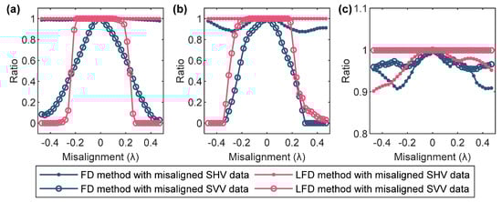 The results of the dihedral scatterer in Figure 13b are similar to those of the plate scatterer. The tolerable range of the LFD method for this data is also estimated to be ±0.2λ. Differently, the misalignments in SHV data had little impact on the FD results, with curves varying between 0.9 and 1. However, the curve of the LFD result was close to 1 when the SHV data was misaligned, which also indicates that the LFD method is more robust.