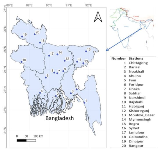 Considering the above factors, investigating the impact of climate variability on tea yields in Bangladesh is well-suited for predicting agricultural crop yields. Interestingly, 96% of the annual tea production comes from the greater Sylhet area, 63% of which is contributed by the Moulvibazar district within the Sylhet division []. Bangladesh lies within the Indo-Gangetic plains of Southeast Asia in a complex delta with rich fertile soil. Three significant rivers (the Ganges, the Meghna, and the Brahmaputra), starting from the Himalayas, flow through the region into the Bay of Bengal. The country is subtropical, with a wet and humid climate []. On average, Bangladesh experiences about 1500 mm to 5000 mm of rainfall annually, with temperature and humidity in the range of 12–30 °C and 65–95%, respectively. In this study we have considered 20 stations in Bangladesh as illustrated in Figure 2. There are 150 tea estates in Sylhet, where most of the tea is produced in Bangladesh. This area is highly suitable due to the hilly nature of the landmass and an elevation in the range of 55 to 335 m. Water stress adversely affects the crop. A specific elevation is required for a greater crop yield as it reduces waterlogging due to heavy rainfall. This suits tea cultivation, which requires an average rainfall of 1000 mm per year. The plants also require a temperature range of 13–25 °C, which is within the temperature range seen throughout Bangladesh [].
