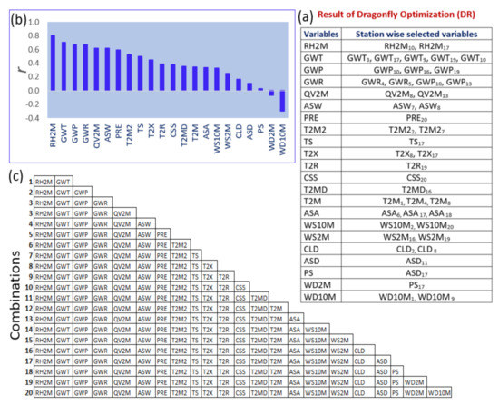 The 22 variables from 20 stations of Bangladesh were collected from the MERRA-2 model to address the prediction problem of tea yield. The list of all predictor variables is tabulated in Table 1. Each variable of 20 stations was then run for the dragonfly optimization (DR) algorithm to select the significant variables from every station. Figure 4a shows the features selected by DR along with the respective stations (subscripted). After that, the study used support vector regression (S) as a feature selection approach in the 2nd step. The machine-learning approach is prevalent in selecting input variables []. The result of SVR is shown in Figure 4b, which shows that RH2M had the highest correlation coefficient (r), where WD10M showed the lowest. Based on the result of SVR shown in Figure 4b, the study constructed different combinations of predictors, adding them one by one in ascending order, as illustrated in Figure 4c. Because of the use of DR, the best-selected predictors were used for model application. With 100 iterations, the optimal number of dragonflies for the DR was fixed at 12.