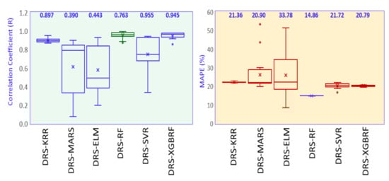 Figure 5 shows the results of an in-depth investigation of the correlation coefficient (r) and MAPE (%), which demonstrated that the proposed hybrid DRS–RF model performed significantly better than other models in predicting Y for the loop of 20 combinations. The r-value and MAPE (%) were distributed between the lower quartile (25th percentile) and the upper quartile (75th percentile). However, one outlier was discovered to be greater than the 25th percentile in terms of the r-value. In contrast, the MAPE showed a very condensed distribution, resulting in an improved performance in predicting the Y value with the RF model coupled with Dragonfly Optimization and support vector regression. The standalone models showed lower r-values, with Figure 5 indicating that the proposed hybrid machine-learning predictive model outperformed various competing methods.